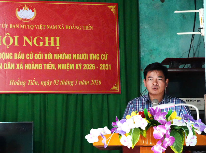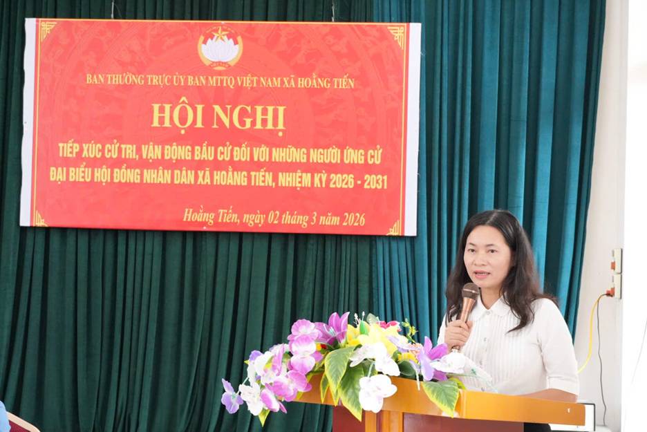🇳gày 02/3/2026, tại hội trường văn hóa thôn Hùng Tiến, Ban Thường trực Ủy ban MTTQ xã Hoằng Tiến đã tổ chức Hội nghị tiếp xúc giữa người ứng cử đại biểu HĐND xã, nhiệm kỳ 2026 - 2031 với cử tri các thôn: Hùng Tiến và Nghĩa Thục (thuộc đơn vị bầu cử số 04) để các ứng cử viên báo cáo chương trình hành động và thực hiện vận động bầu cử.