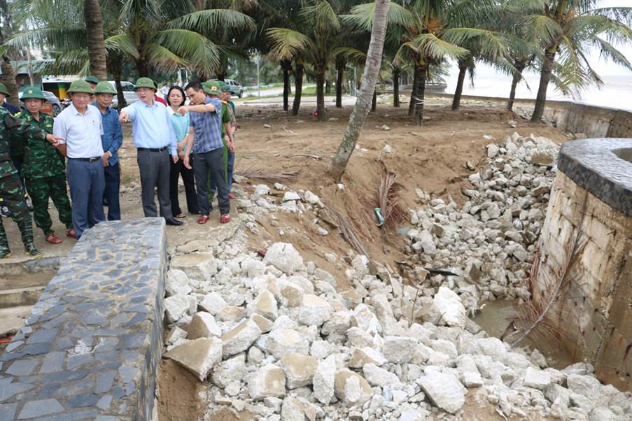 tra tình hình sạt lở công trình kè bờ biển. Do ảnh hưởng của bão số 5 (sóng lớn