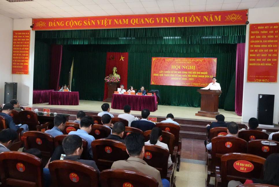 Đồng chí Lê Xuân Hoàn, Chủ tịch UBND xã, đại diện người được giới thiệu ứng cử phát biểu bày tỏ tinh thần trách nhiệm, nghiêm túc tiếp thu ý kiến đóng góp của cử tri; khẳng định nếu được tín nhiệm bầu làm đại biểu HĐND xã sẽ tiếp tục nỗ lực rèn luyện, nâng cao bản lĩnh chính trị, năng lực công tác, thực hiện tốt vai trò người đại biểu dân cử. Đại diện cơ quan, tổ chức, đơn vị giới thiệu người ứng cử cũng phát biểu ý kiến làm rõ thêm về quá trình công tác, phẩm chất, uy tín và năng lực của các nhân sự được giới thiệu.